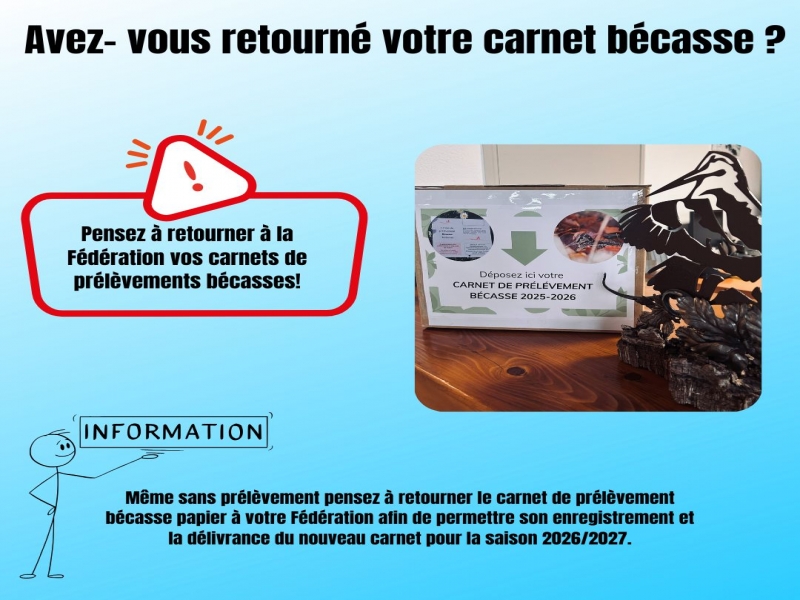 Même sans prélèvement, le carnet doit être transmis afin de permettre son enregistrement et la délivrance de votre nouveau carnet pour la saison 2026/2027.