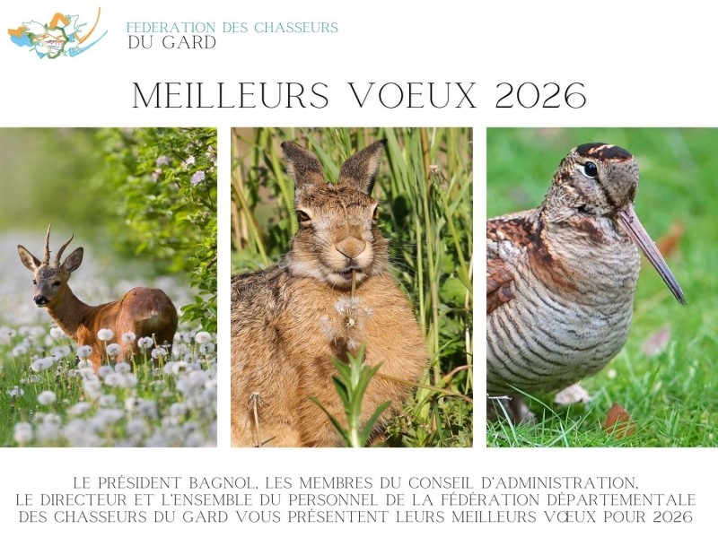 Le Président Gilbert BAGNOL et les membres du Conseil d'Administration, le Directeur Marc VALAT et l'ensemble du personnel de la Fédération Départementale des Chasseurs du Gard vous présentent leurs meilleurs v...
