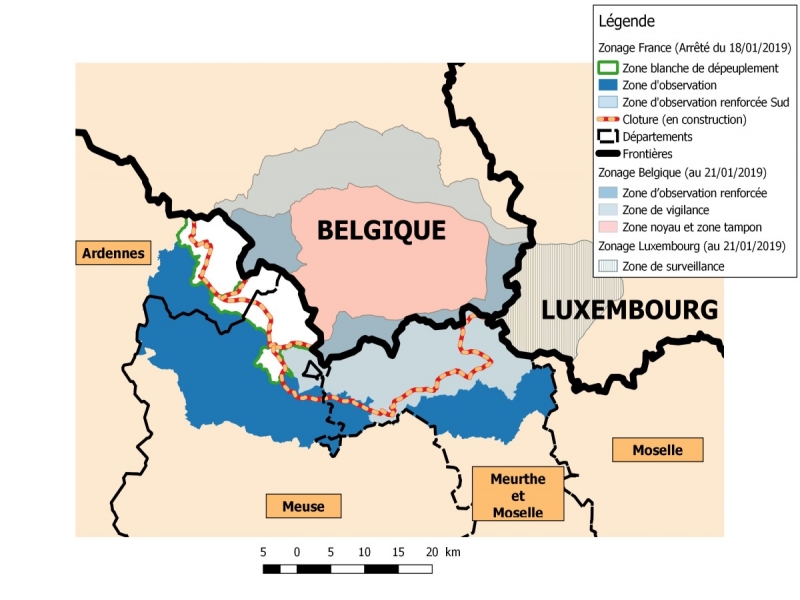 La pose d’une clôture, en France, à environ 6 km de la frontière est en cours, découpée en 3 tronçons avec une mise en œuvre échelonnée dans le temps, en commençant par la zone la plus à risque dans le département de la Meuse. Cette clôture isolera deux compartiments, en regard de la Meuse et des Ardennes, représentant une surface totale d’environ 140 km2 au sein desquels les sangliers devront être éradiqués.
