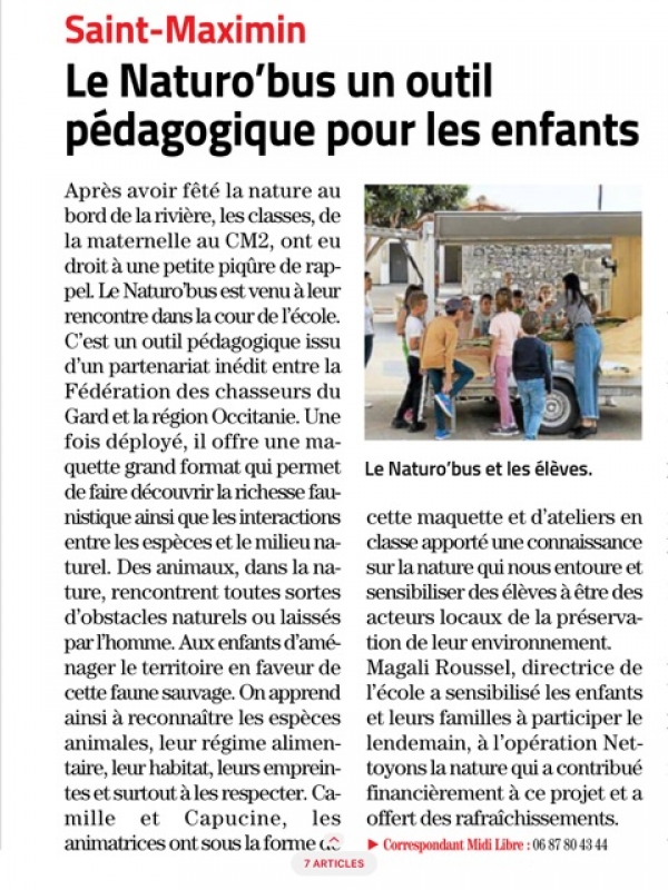 Chaque année, ce sont ainsi les 4 classes de l’école qui bénéficient d’au moins une demi-journée animation portant sur la découverte de la faune et de la flore des garrigues A titre d’exemples, au printemps 2022, ce sont ainsi 80 élèves qui ont pu bénéficier d’une animation portant sur la thématique de la rivière. En septembre dernier, ces mêmes classes ont poursuivi le travail déjà réalisé en bénéficiant d’une animation autour du Naturo’bus, observatoire ambulant de la biodiversité et de découverte de la Trame Verte et Bleue, et d’ateliers spécifiques en classes.