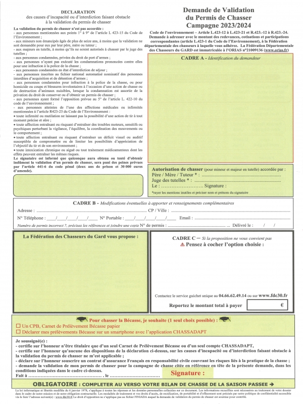 - la délivrance de la validation nationale du permis de chasser 2023/2024, toutes espèces avec une assurance RC,