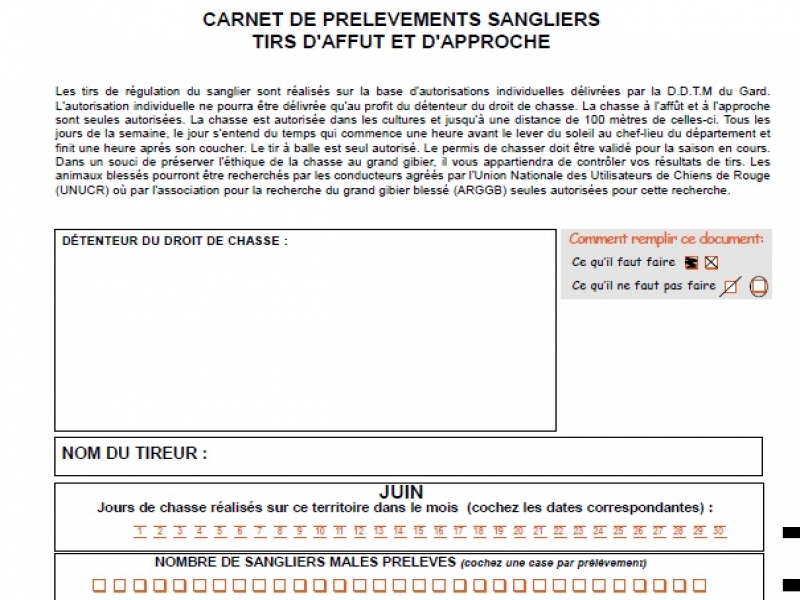 Pour les bénéficiaires d’une autorisation de tir du sanglier à l’affût et à l’approche entre le 1er juin et le 14 août, Nous rappelons que chaque tireur doit rendre sa fiche de prél...